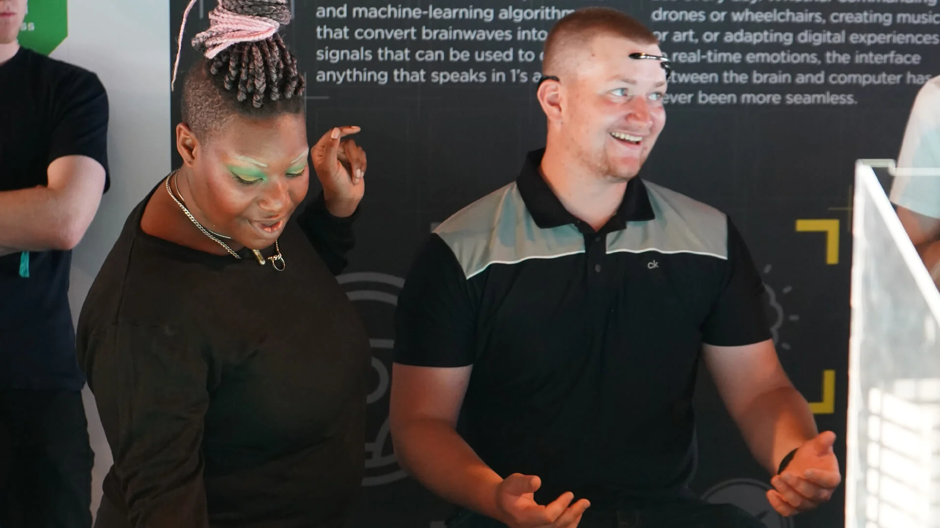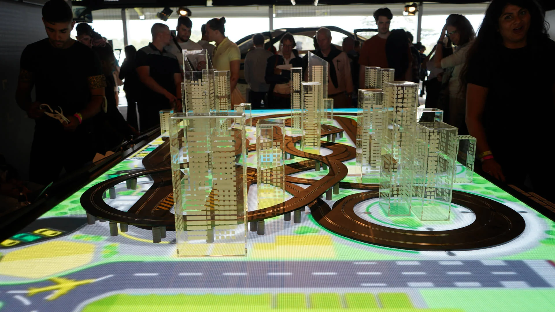 The installation housed graphically animated screens below the track to attract visitors. Users would be given tasks to focus on whilst being configured to the headset, and use their minds to power their cars. The better focus, the quicker the car would go round.